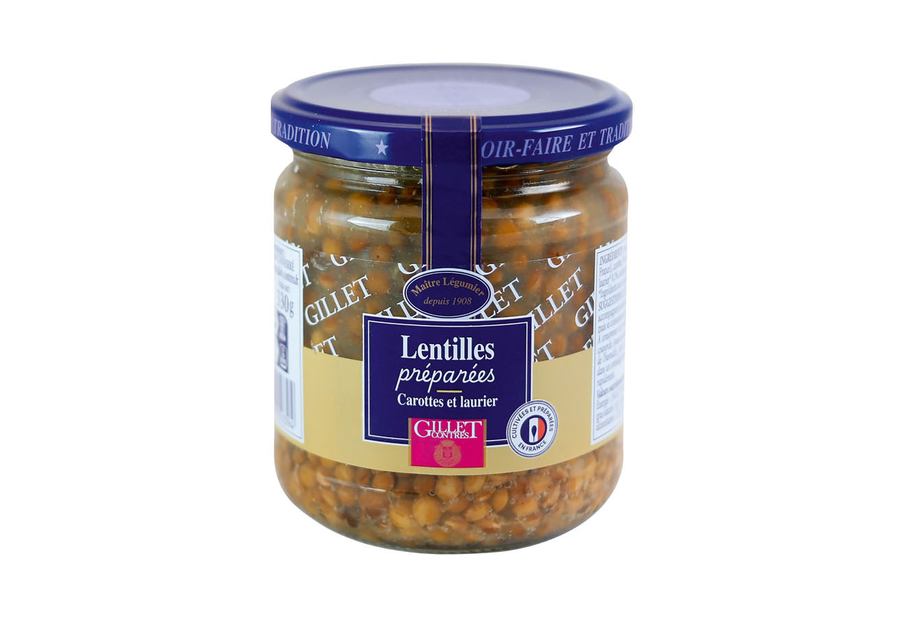 Eau, lentilles vertes trempées (origine France) 43%, carottes 3% (origine France), oignons, sel, poivre, ail, laurier 0,1% (origine non-UE ), arôme naturel.