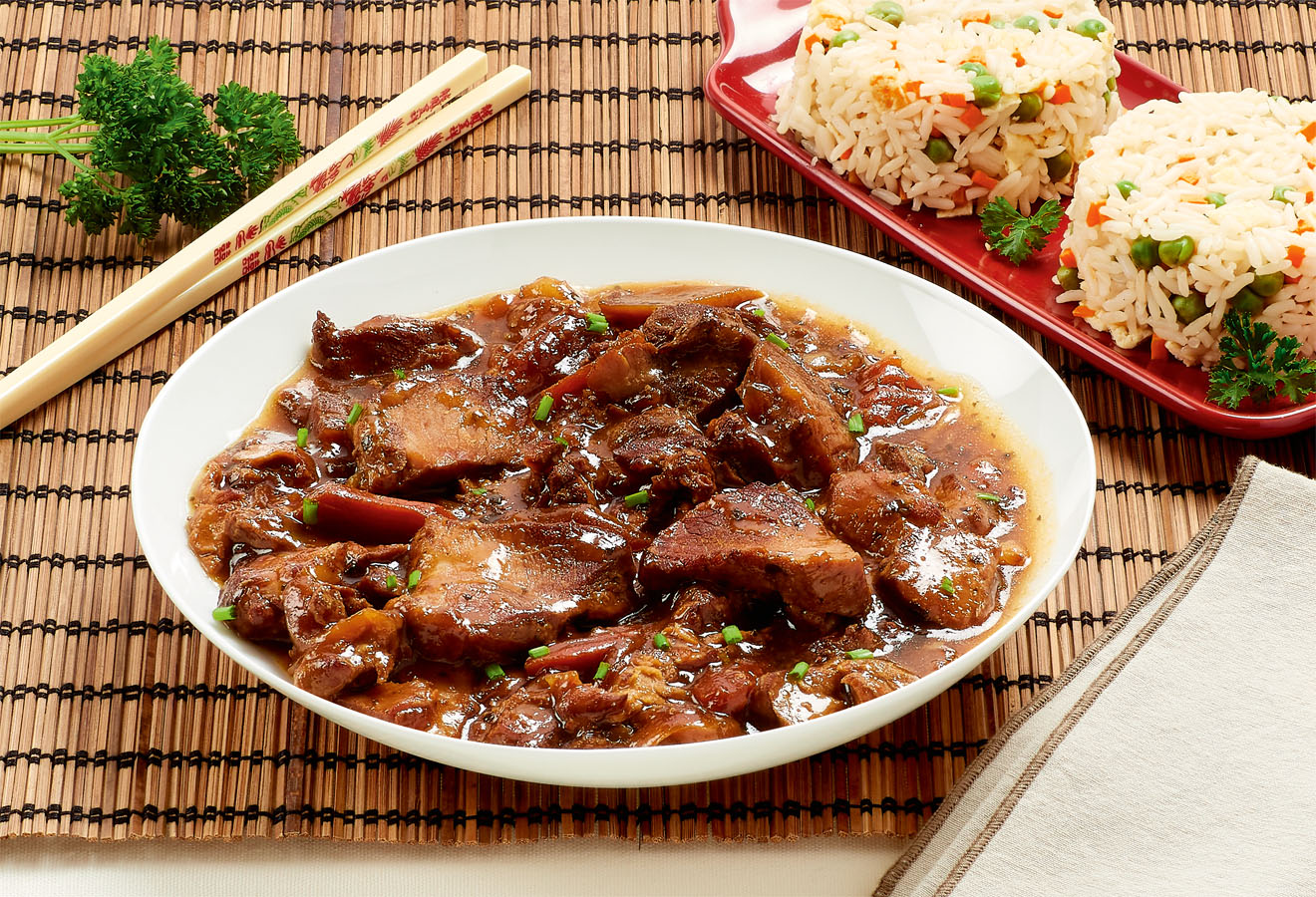 Viande de porc (origine : UE) 57%, oignon, eau, sauce SOJA (eau, graine de SOJA, BLE (GLUTEN), sel, vinaigre d'alcool, alcool éthylique, sucre), caramel (sucre, eau) 3,5%, sucre, carotte, pousse de bambou, huile de tournesol, gingembre, amidon de riz, extrait de chicorée liquide (extrait de chicorée, eau),sel, coriandre, ail, galanga, fibre de lin, poivre.